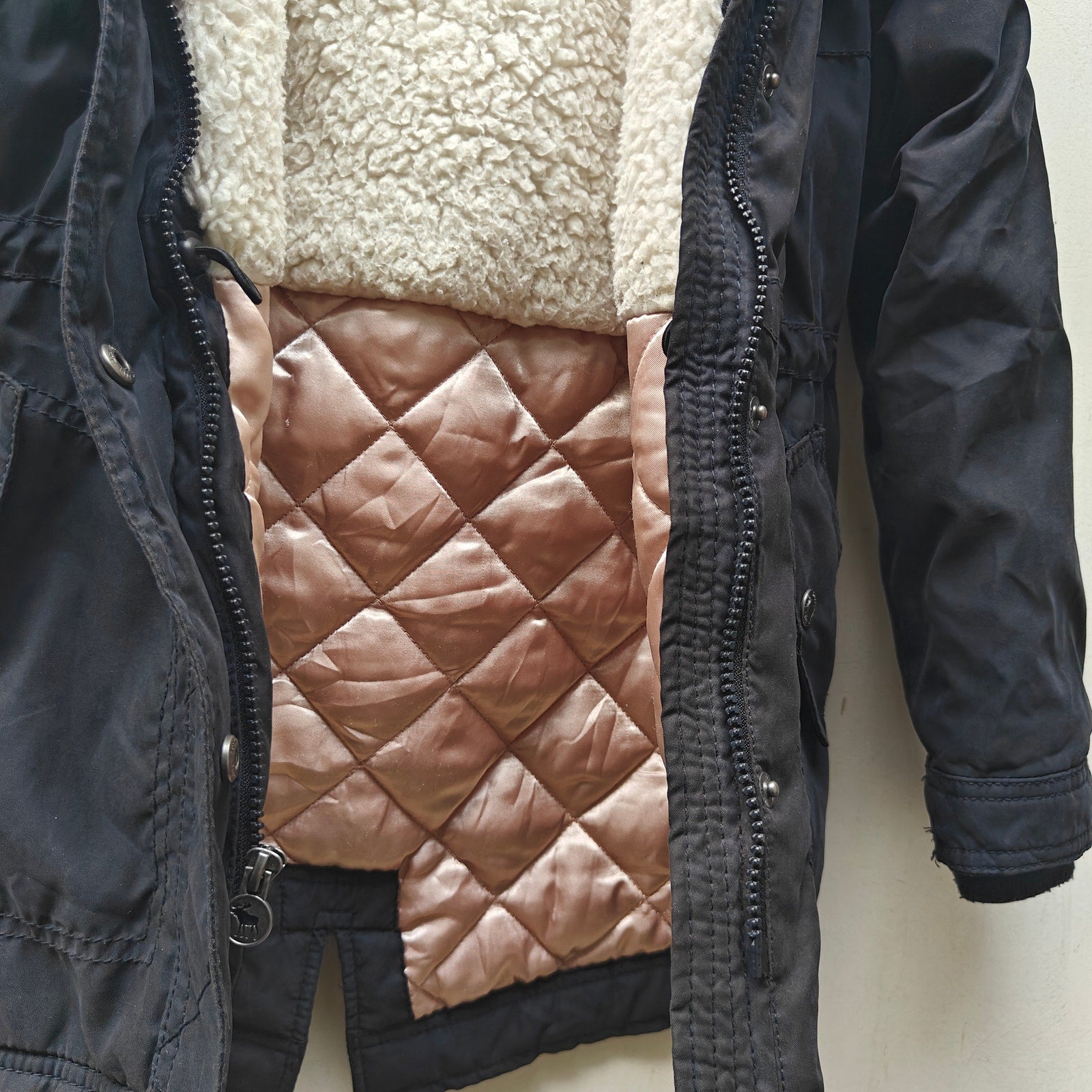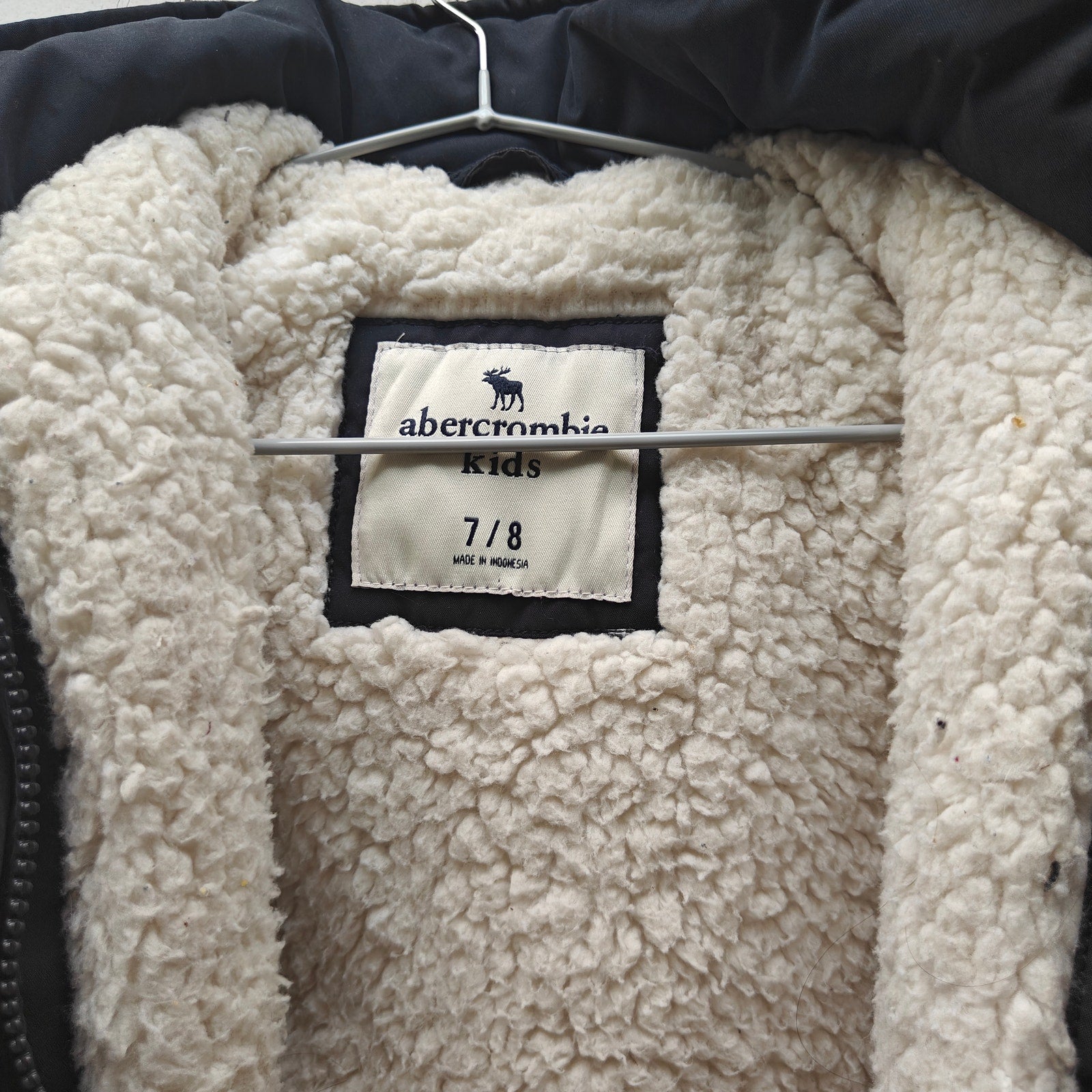 abercrombie kids, parka, winter coat, black, sherpa lined, quilted lining, faux fur hood, hooded, zipper, 7/8, warm, school, cold weather