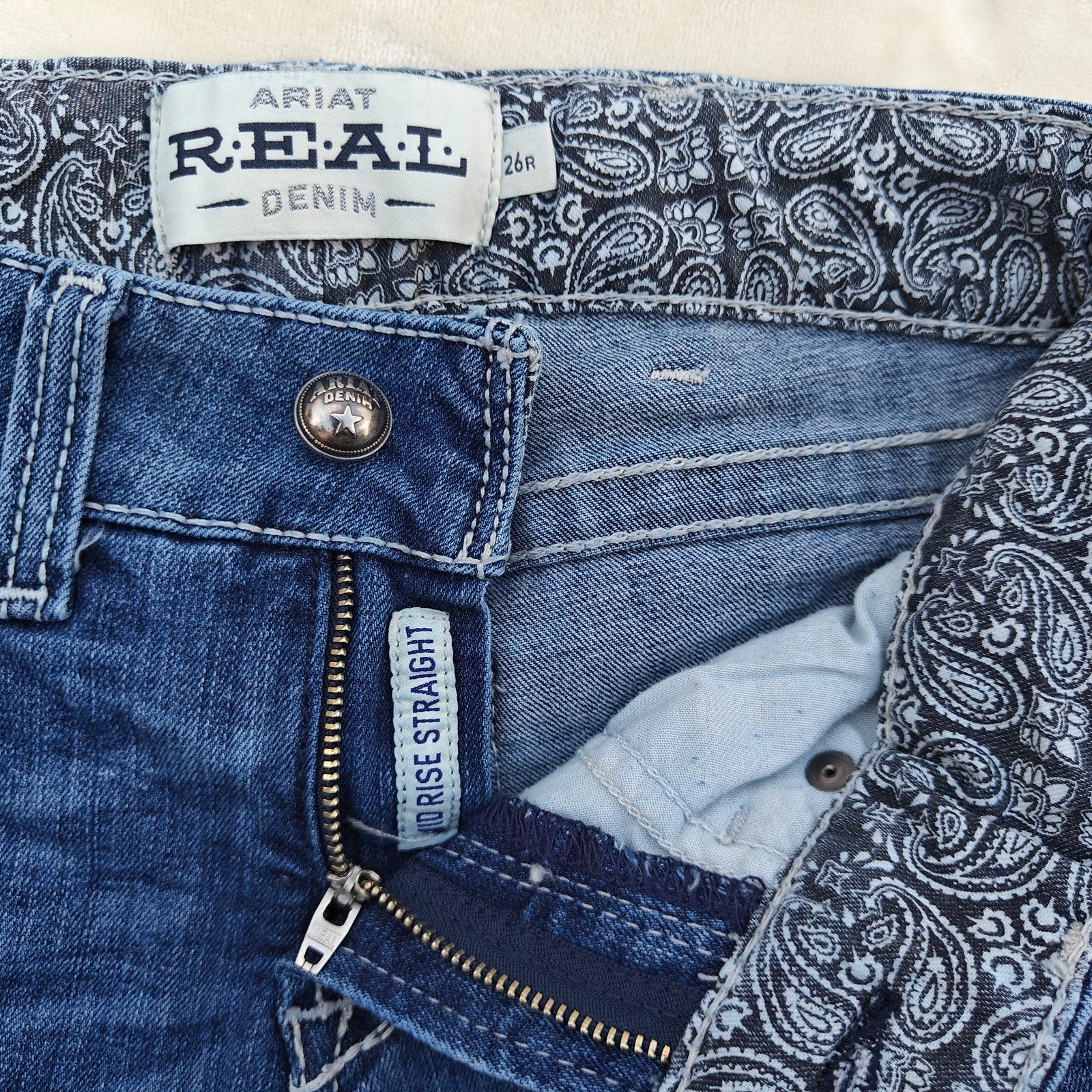 Details: classic 5-pocket, Ariat hardware, paisley pocketing