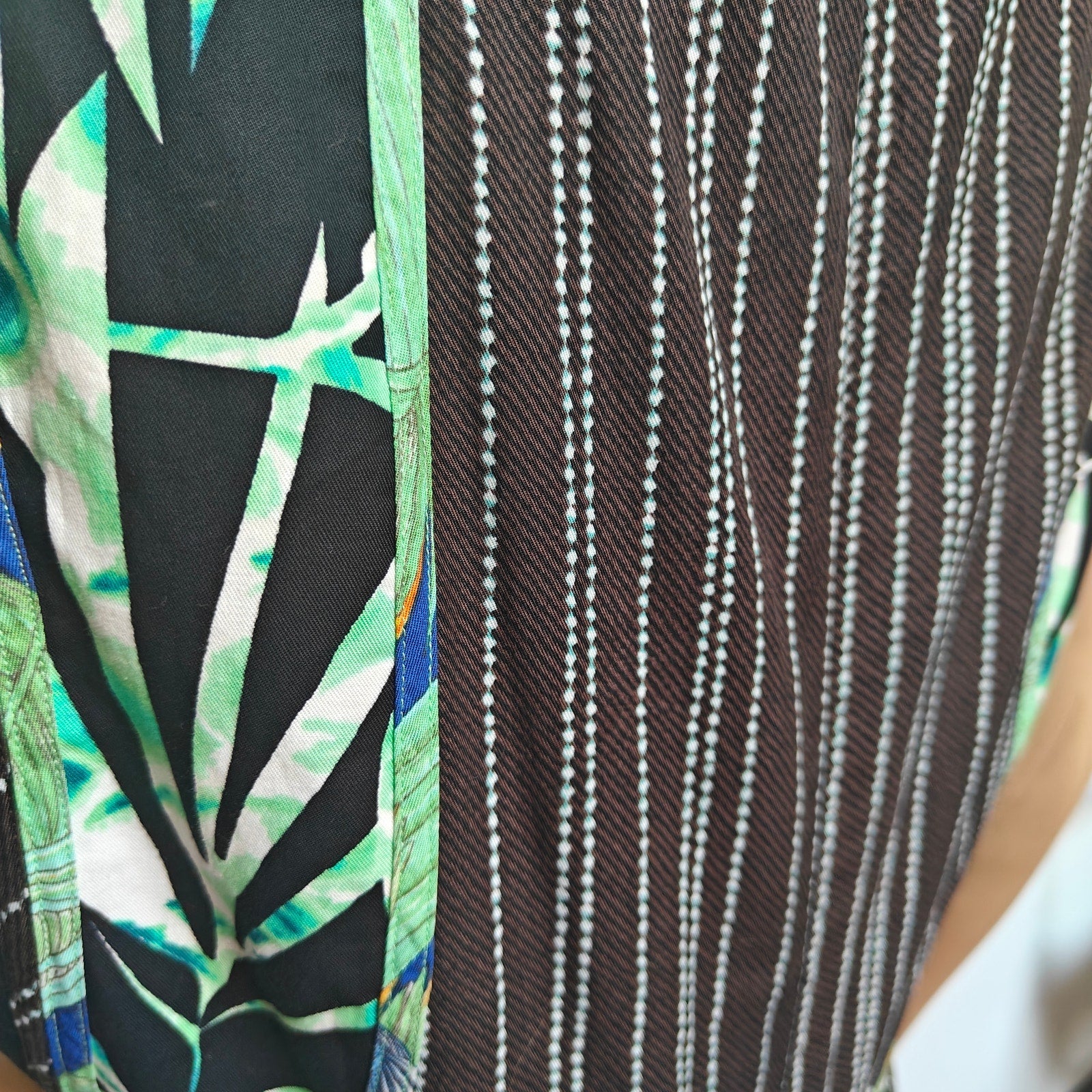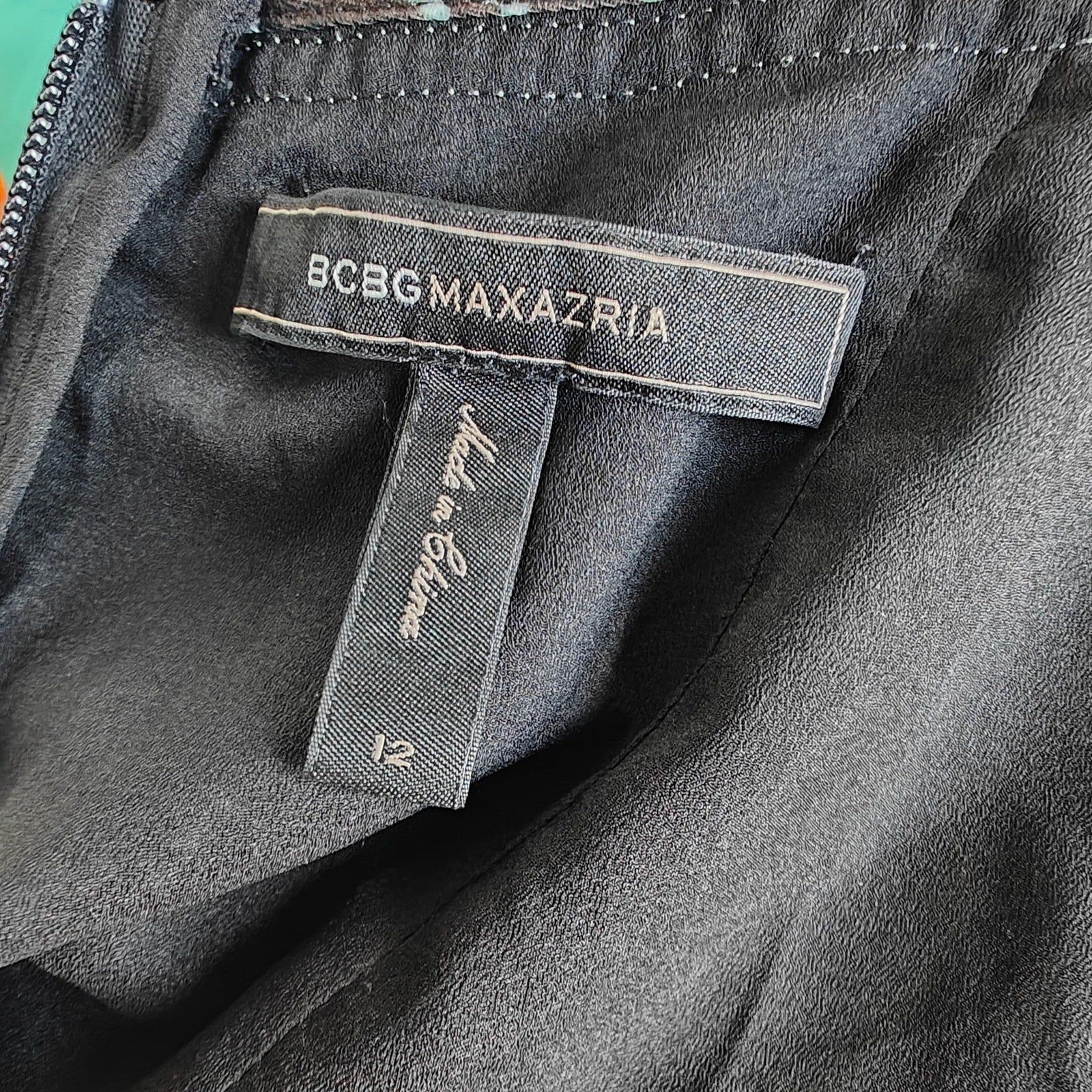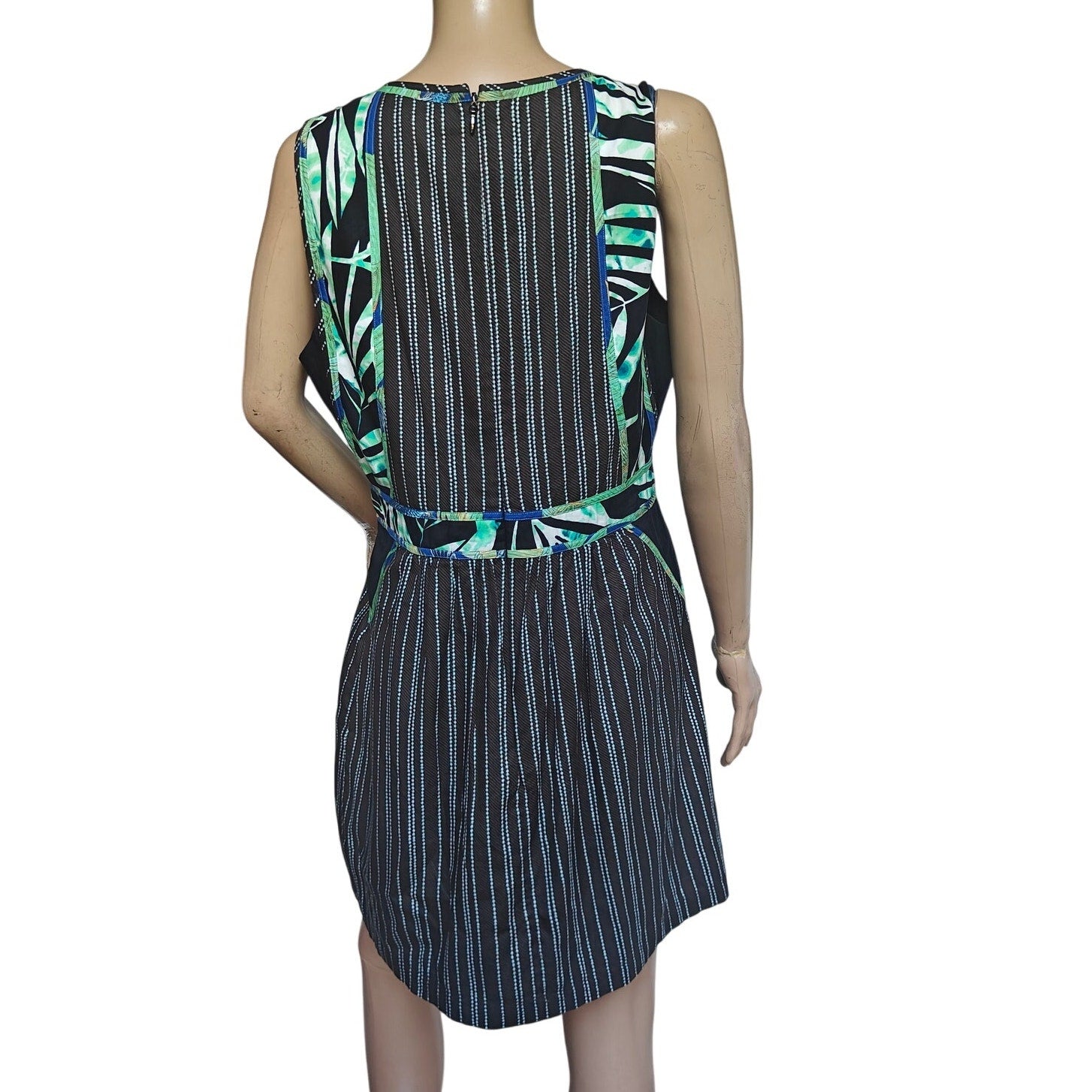 Chic and modern BCBGMAXAZRIA sleeveless fit-and-flare dress in Size 12. This striking piece features a brown base with fine vertical pinstripes and bold tropical green and blue contrast panels at the neckline and waist for a figure-flattering accent. The structured silhouette, tailored waist, and lightweight woven fabric create a polished yet playful look. Fully lined with a concealed back zip for a smooth finish.