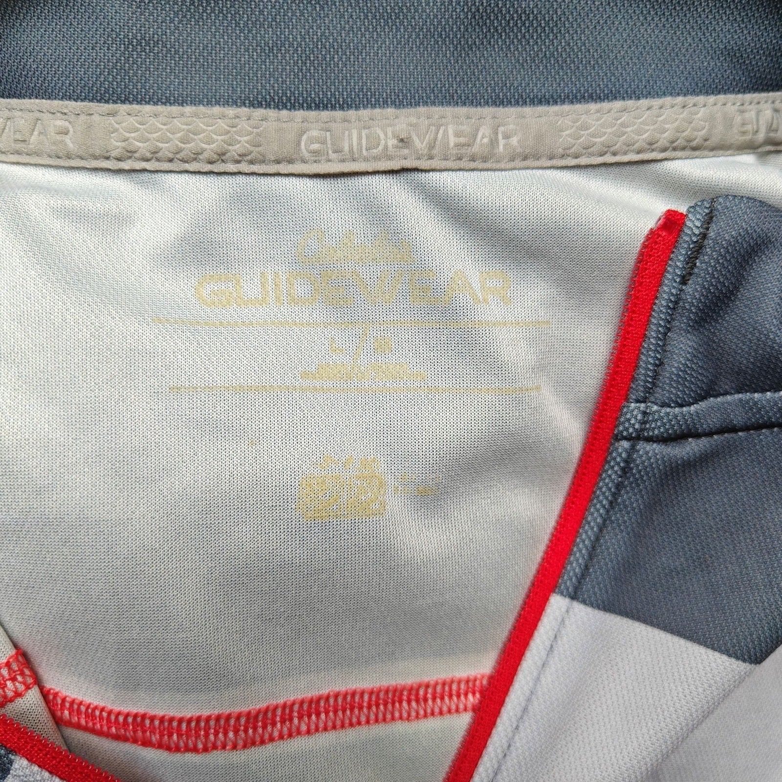 Stay comfortable and protected on the water with this Cabela’s Guidewear men’s quarter-zip pullover in size Large (L). Designed for anglers and outdoor enthusiasts, this long sleeve features moisture-wicking performance fabric, a bold gray, red, and black design, and a convenient zip neck for ventilation. Perfect for fishing, boating, or casual outdoor wear.