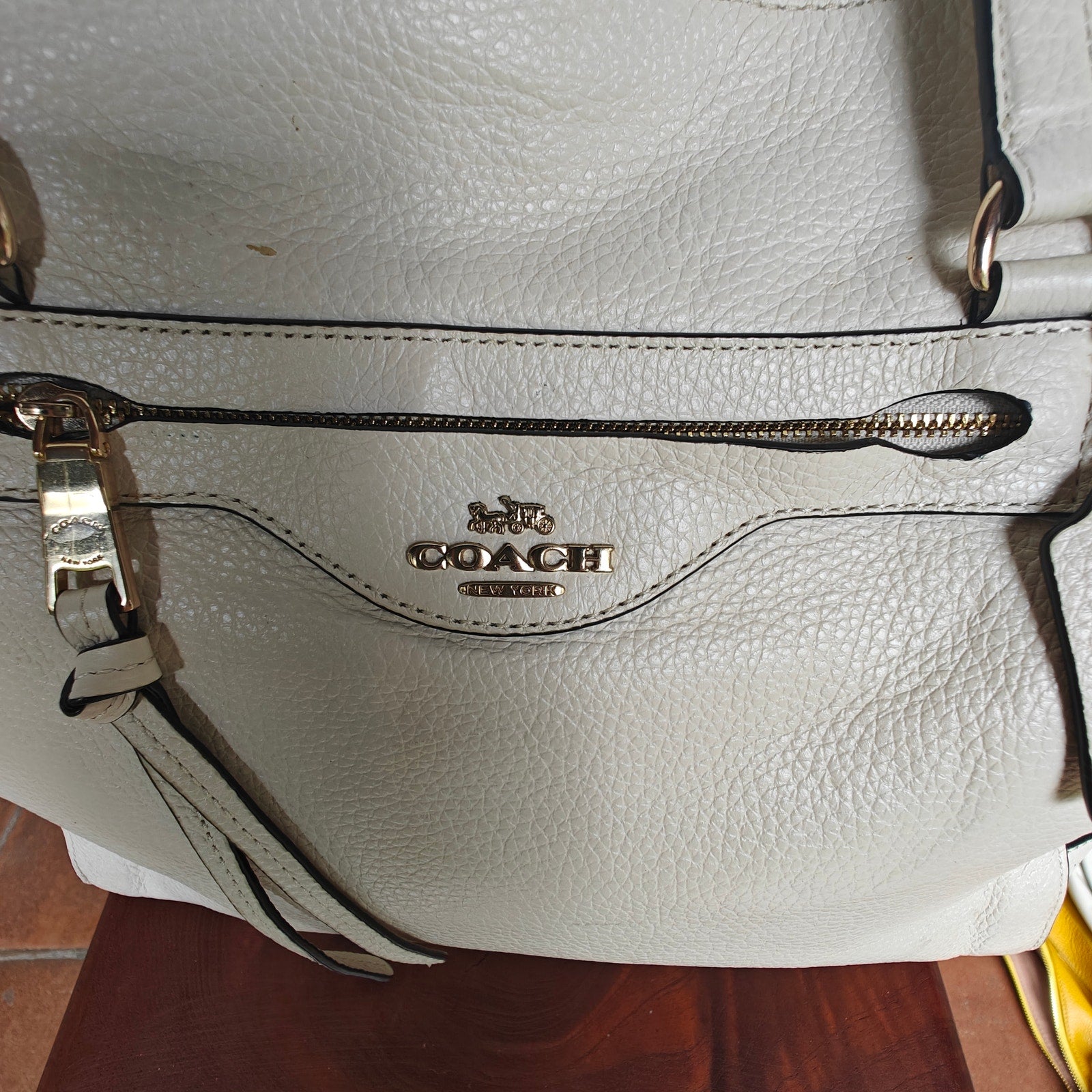 Coach tote, chalk leather bag, pebbled leather shoulder bag, large work bag, zip top, gold hardware, authentic Coach purse.