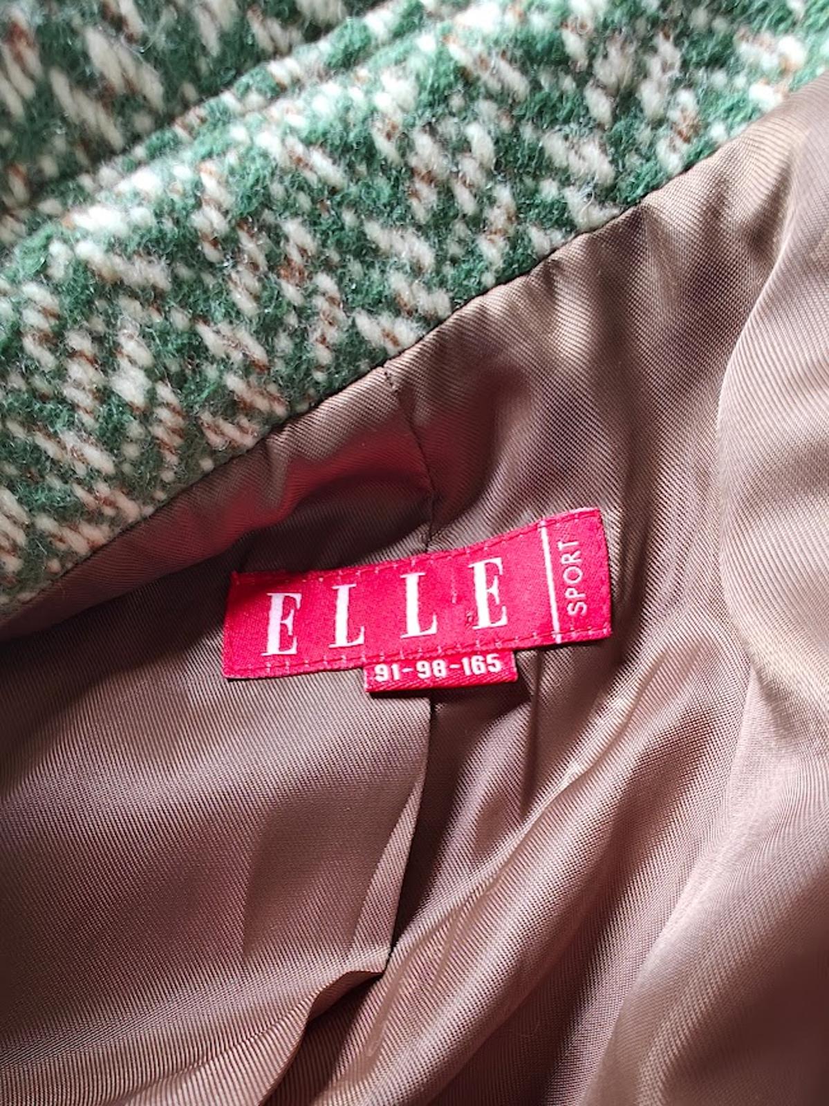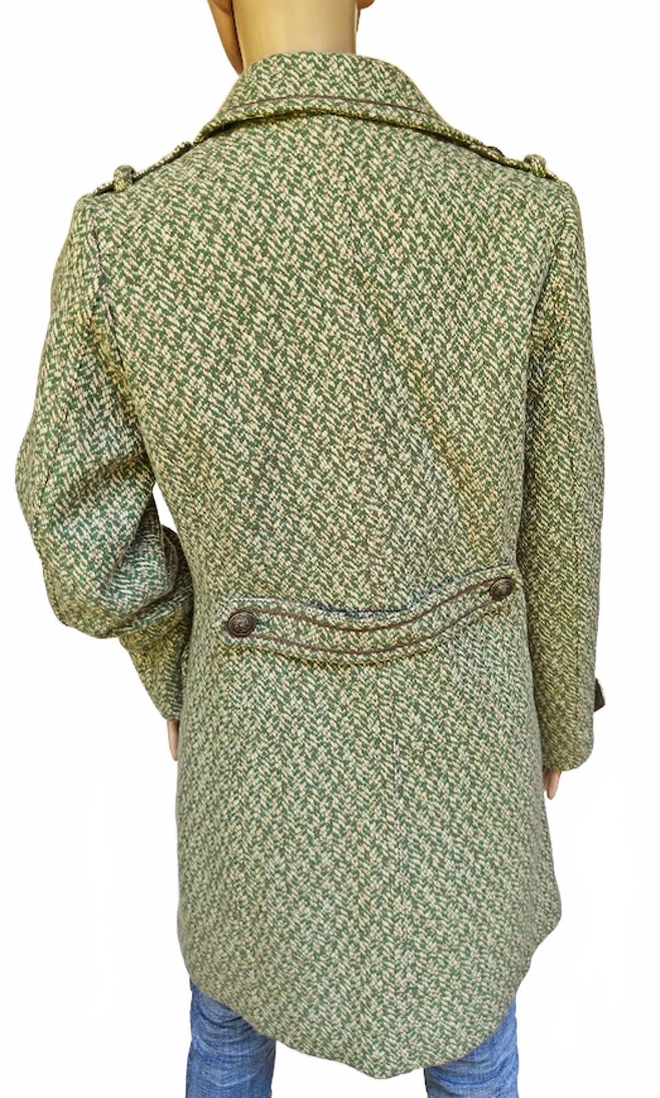 Elevate your cold-weather wardrobe with this chic green wool blend tweed coat in women’s size small (S). Designed with a flattering tailored fit, this double-breasted long coat features a structured collar, decorative button details, and side pockets for both style and functionality. The unique woven tweed pattern adds a touch of sophistication, making it a timeless outerwear piece.
