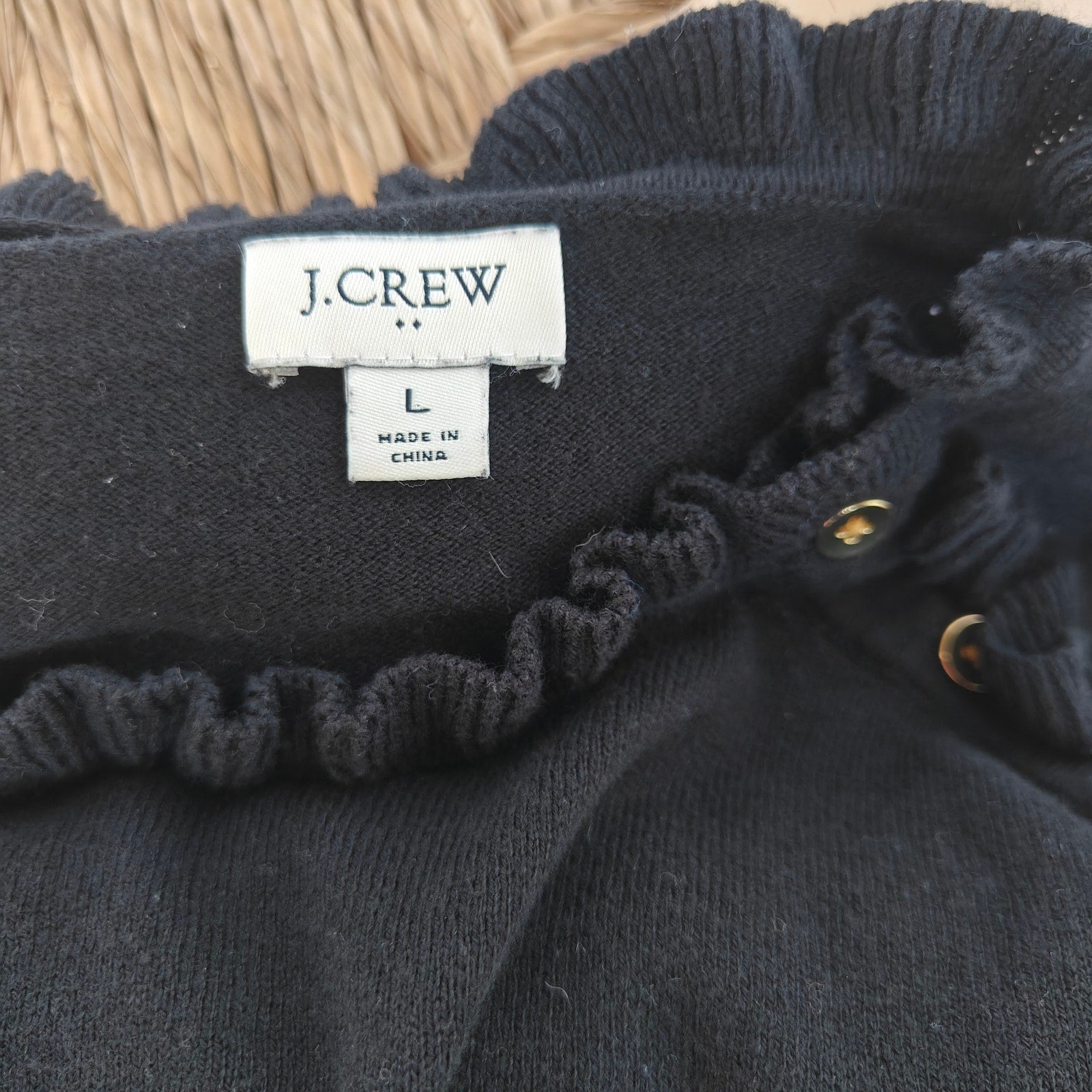 Chic J.Crew pullover sweater in classic black with a feminine ruffle mock neck and gold-tone shoulder buttons. Long sleeves, straight hem, easy slim fit—perfect dressed up with trousers or casual with denim. Women’s size Large. Gently worn; no major flaws noted.