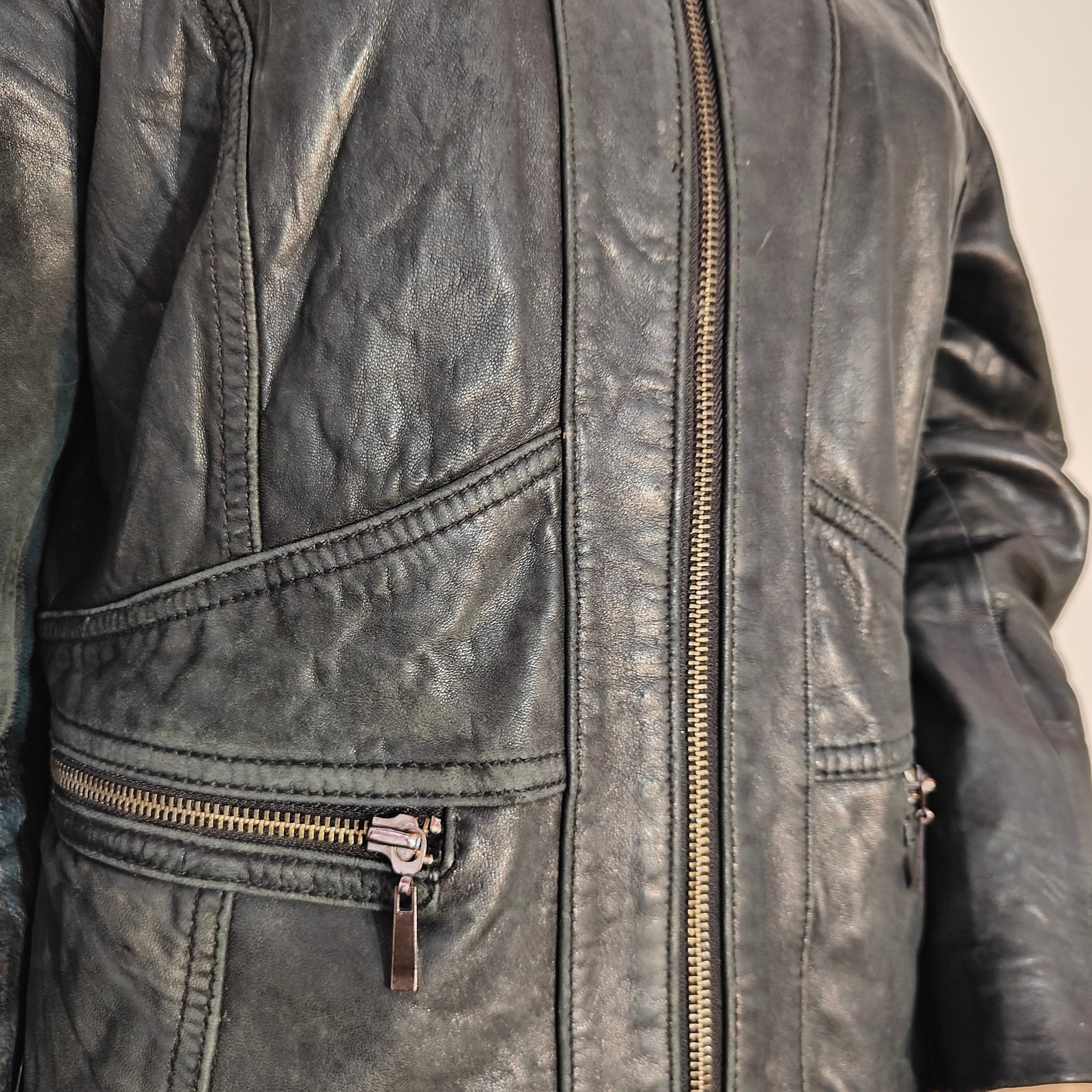 Sleek, timeless moto style from Kenneth Cole Reaction. This genuine leather jacket features a stand collar, full zip front, quilted shoulder detail, flattering paneled seams, and two zip hand pockets. Fully lined for comfort. Tag reads L / 40 (women’s). Classic black that pairs with everything—great layered over tees, sweaters, or dresses.