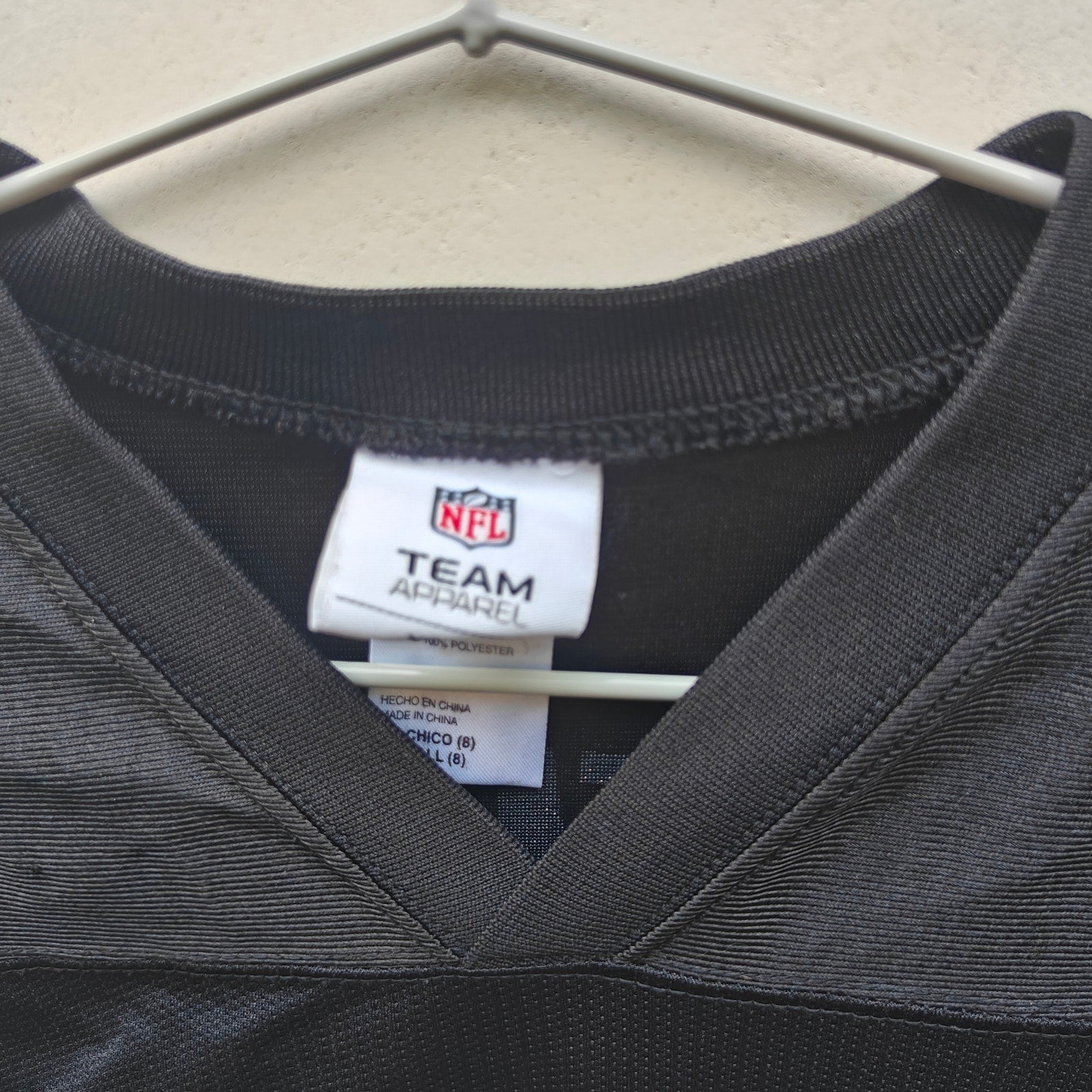 Black mesh official NFL Team #20 McFadden Raiders jersey, youth L (8). Metallic silver print. Clean, sporty fan gear.
