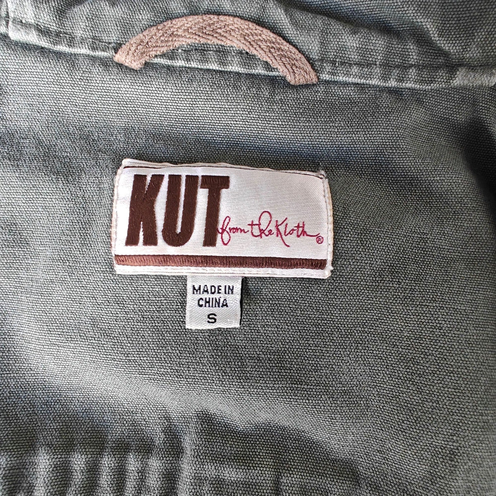 Elevate your casual style with this KUT from the Kloth utility jacket in a versatile olive green color. This women’s size small jacket features a flattering tailored fit with snap and zip front closure, multiple utility pockets, and button detailing for a rugged military-inspired look. Perfect for layering in spring or fall, it offers both functionality and timeless fashion.