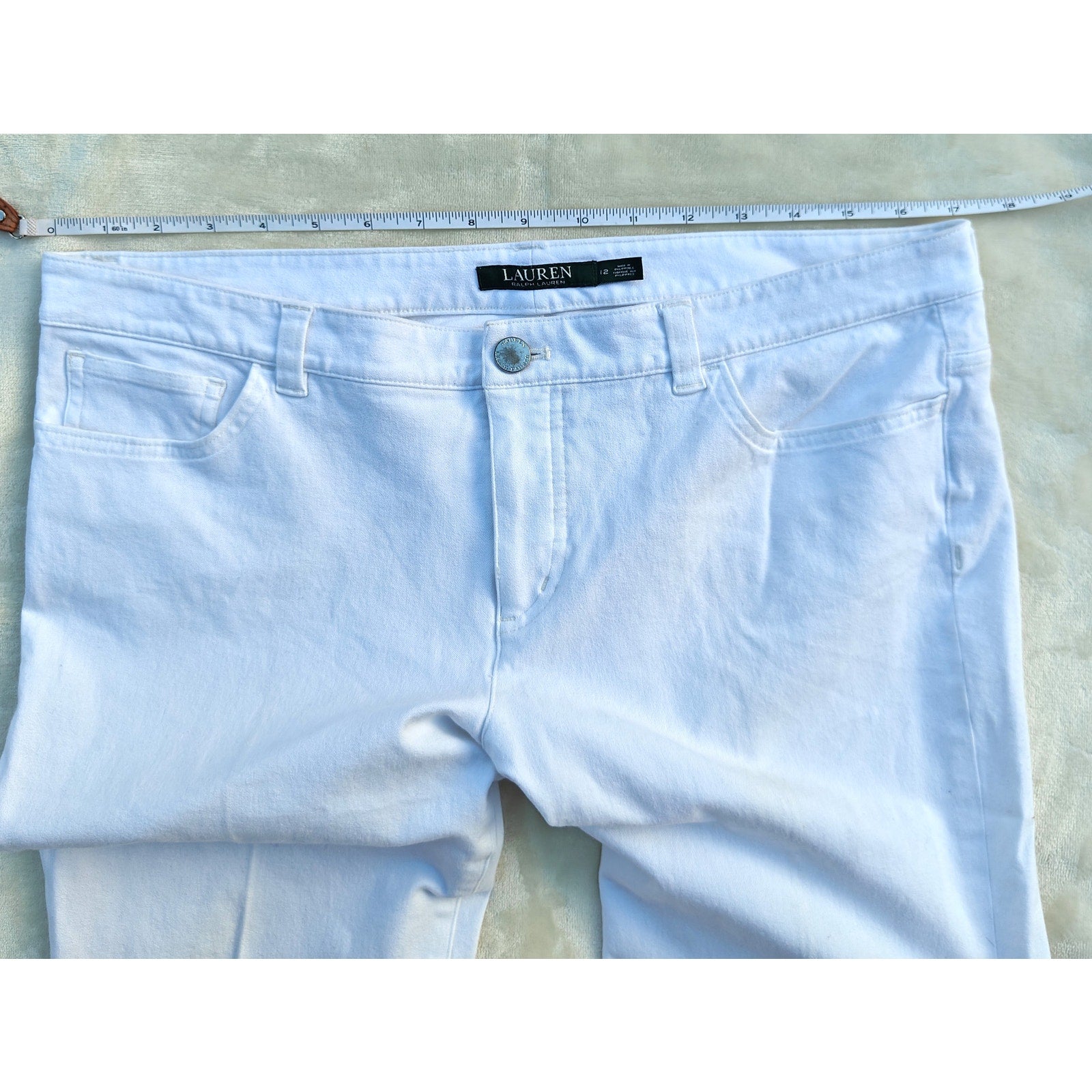 Crisp white Lauren Ralph Lauren skinny jeans in women’s size 12. Classic five-pocket styling with zip fly & button closure, comfy stretch denim that smooths and moves, and a flattering mid-rise skinny/ankle silhouette—perfect with tees, blouses, or summer sweaters. Color is a true bright white.