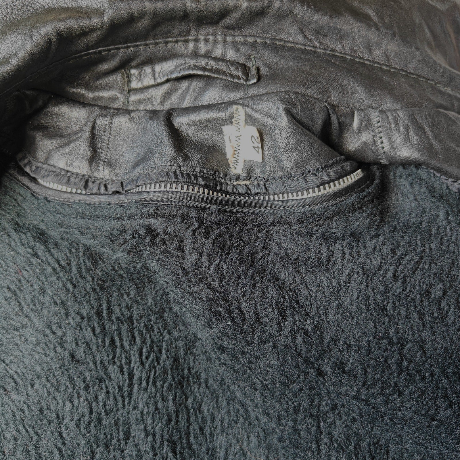 Belted waist, cuff straps, wide lapels, button front, and zip-out pile liner for warmth. Two hand pockets. Tagged 42. Nice vintage patina; clean and ready to wear.