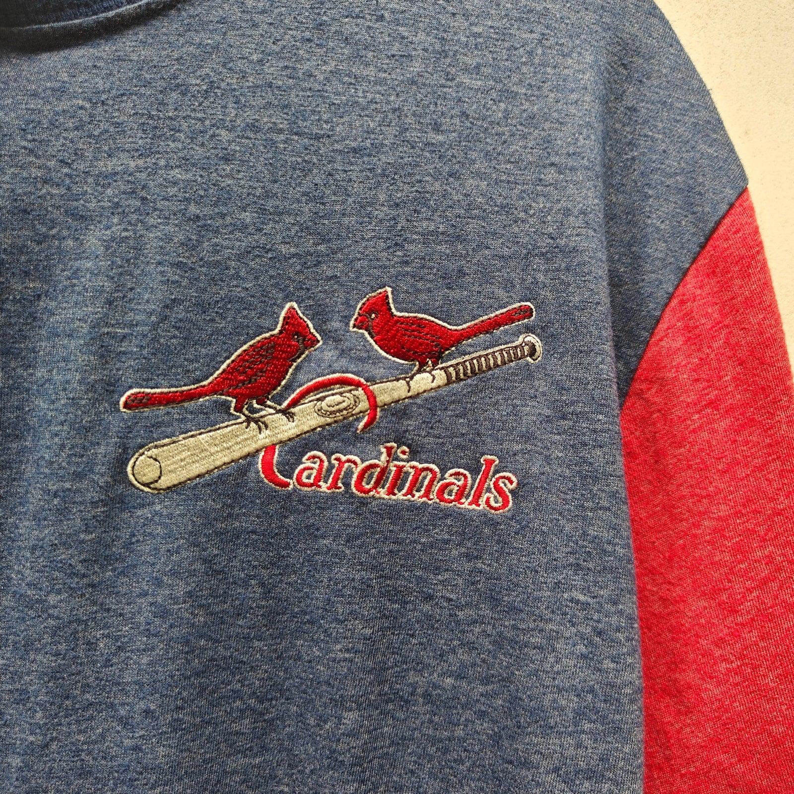 sleeves, stripe detail, and embroidered Cardinals birds-on-bat logo. Soft
