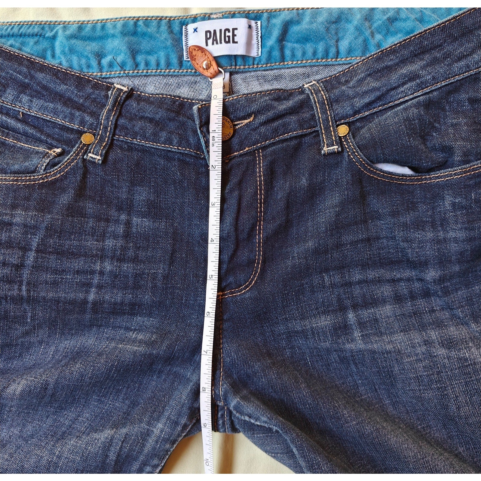 Classic PAIGE “Jimmy Jimmy Skinny” jeans in a dark indigo wash. Soft, comfy stretch denim with a mid-rise, five-pocket styling, and zip fly. Flattering skinny leg that’s perfect with sneakers or boots. Gently worn; no holes or stains noted.