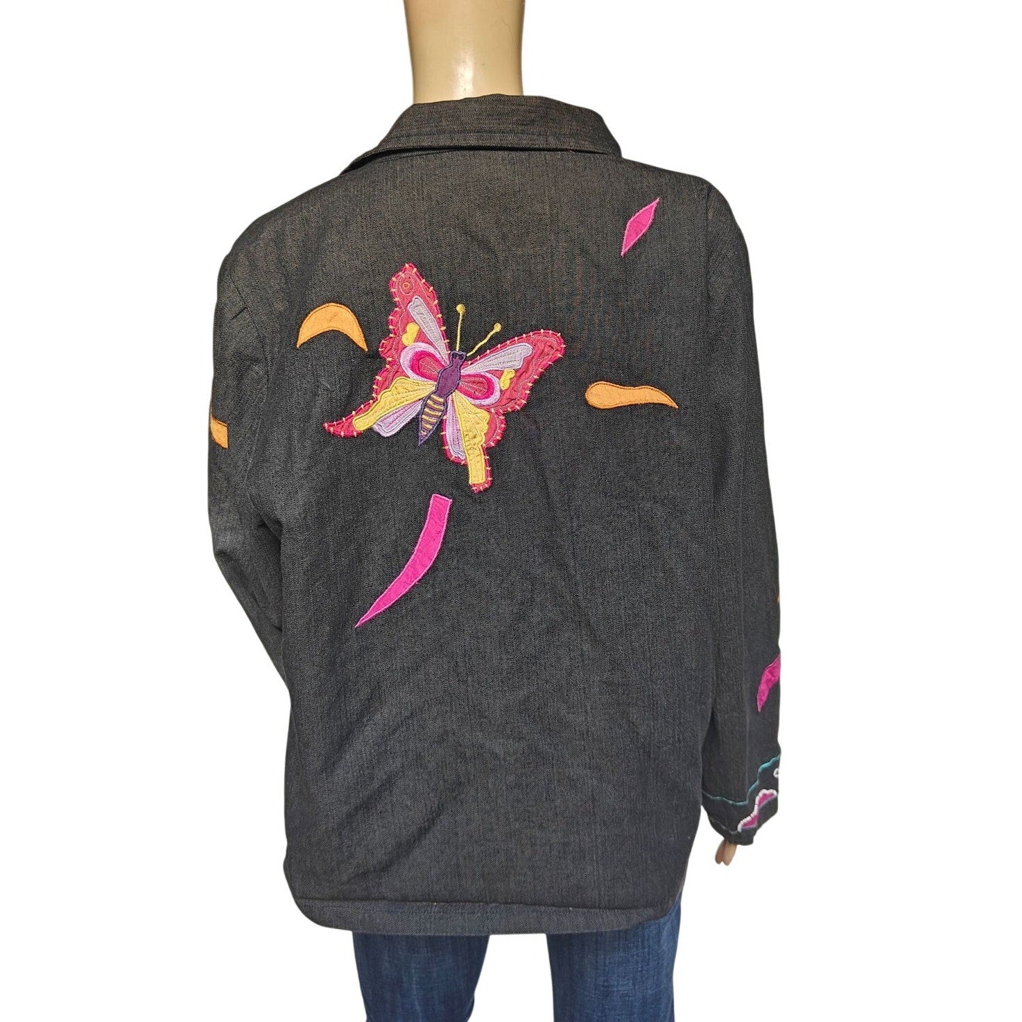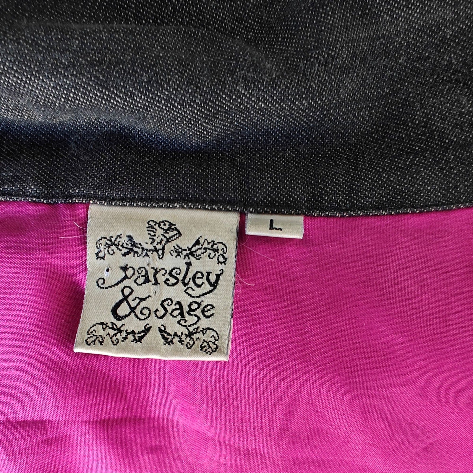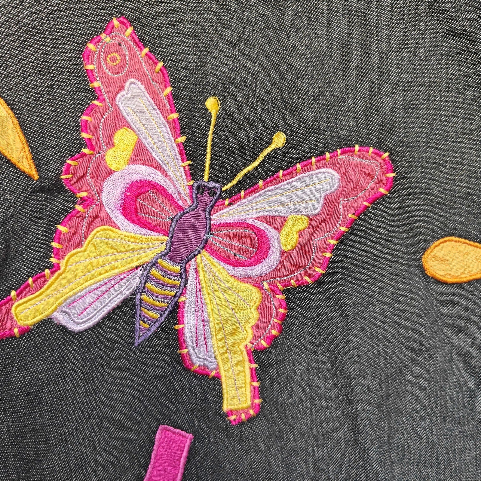 Unique and vibrant Parsley & Sage embroidered jacket in a women’s size Large. Features colorful floral embroidery, patchwork accents, and a boho-inspired design with bold pops of pink, orange, and yellow on a black base. Fully lined in hot pink satin for extra comfort and style.