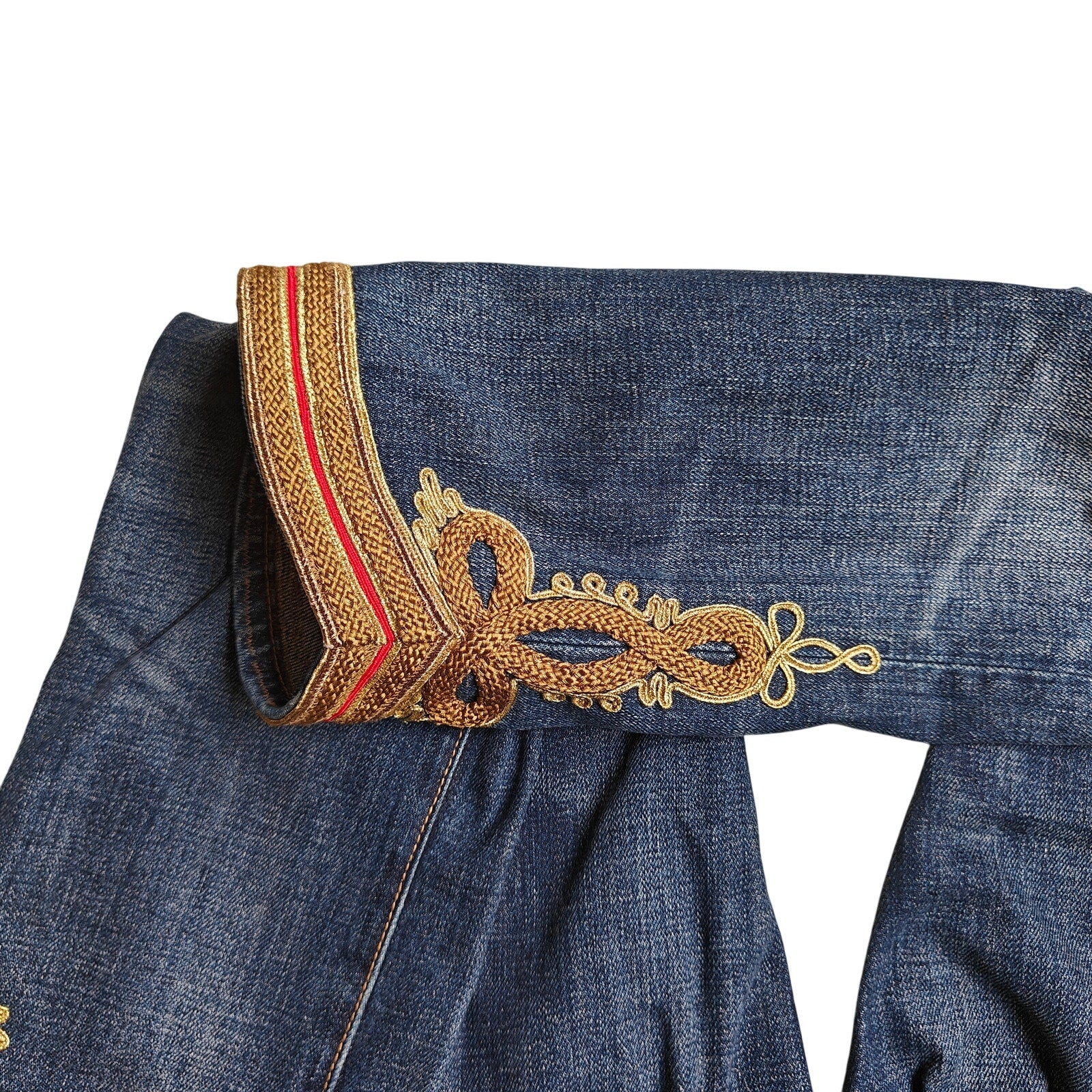 Authentic Polo Ralph Lauren “The Waverly Straight Crop” jeans in size 26. These premium denim jeans feature a flattering straight crop cut with distressed details on the front and unique embroidered accents at the hem in gold and red. A rare and stylish piece that blends classic Polo heritage with modern fashion.
