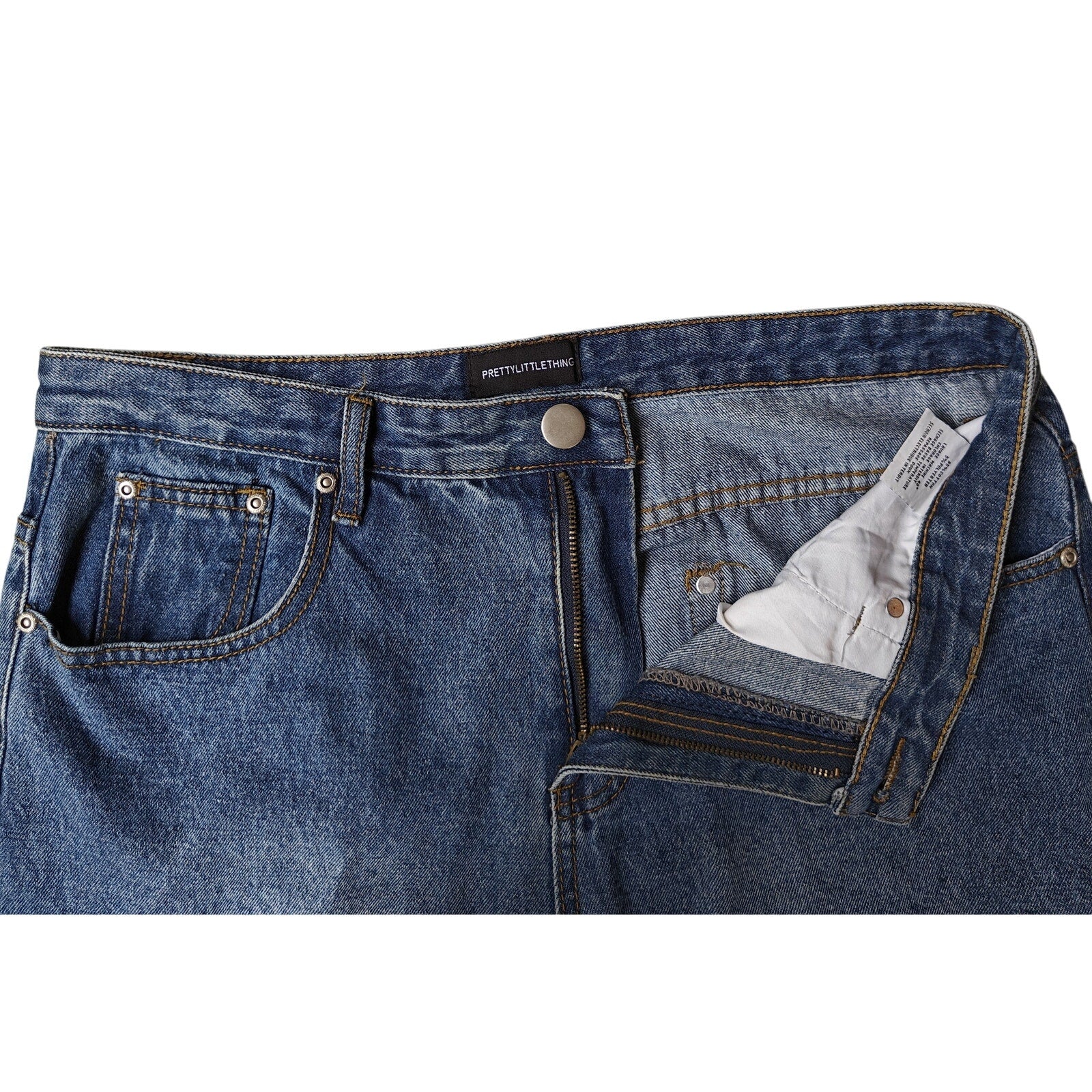 Trendy PrettyLittleThing distressed mom jeans in a classic medium blue wash. These jeans feature ripped knees, raw hem detailing, and a relaxed tapered leg for that effortless street-style vibe. Perfect for pairing with crop tops, hoodies, or oversized sweaters.