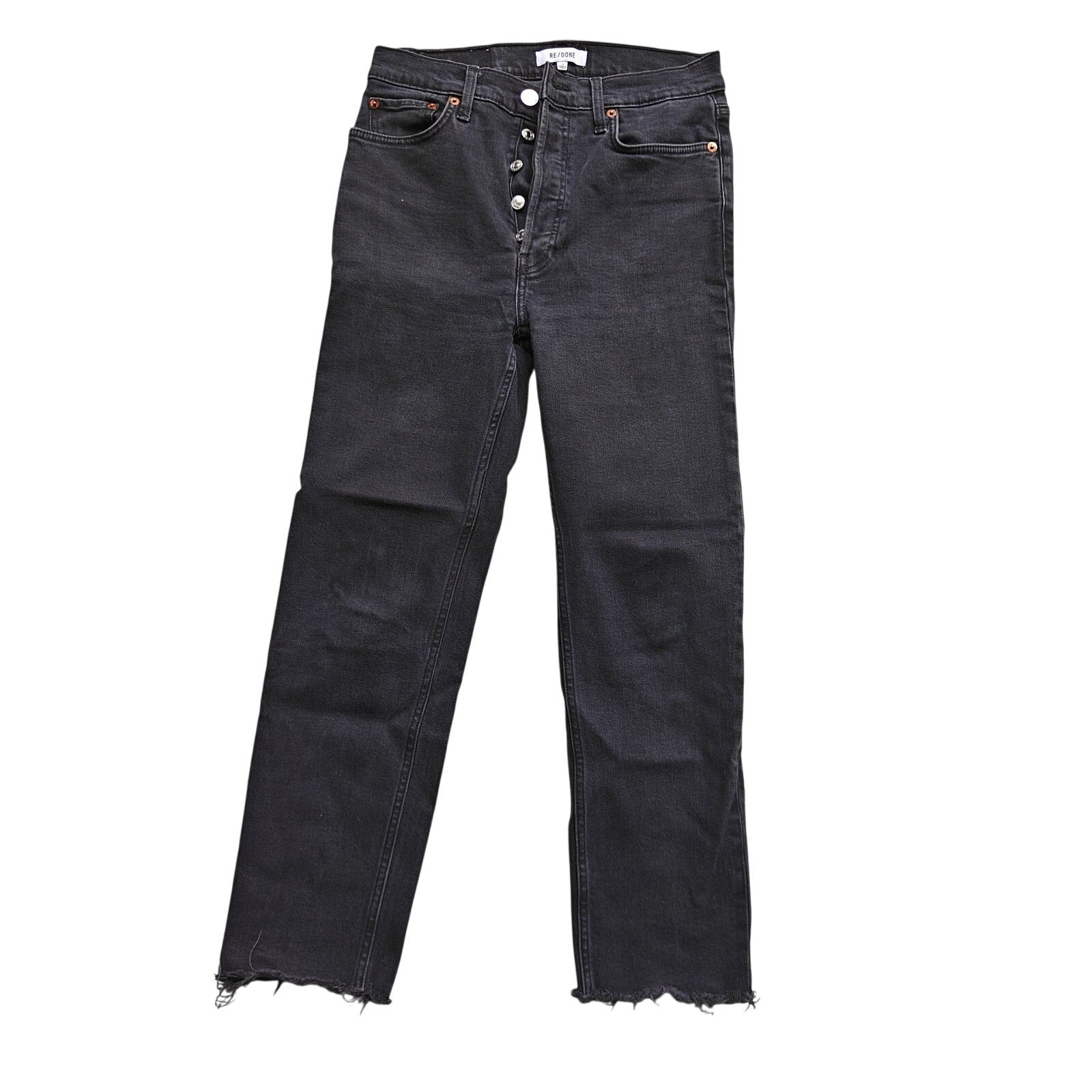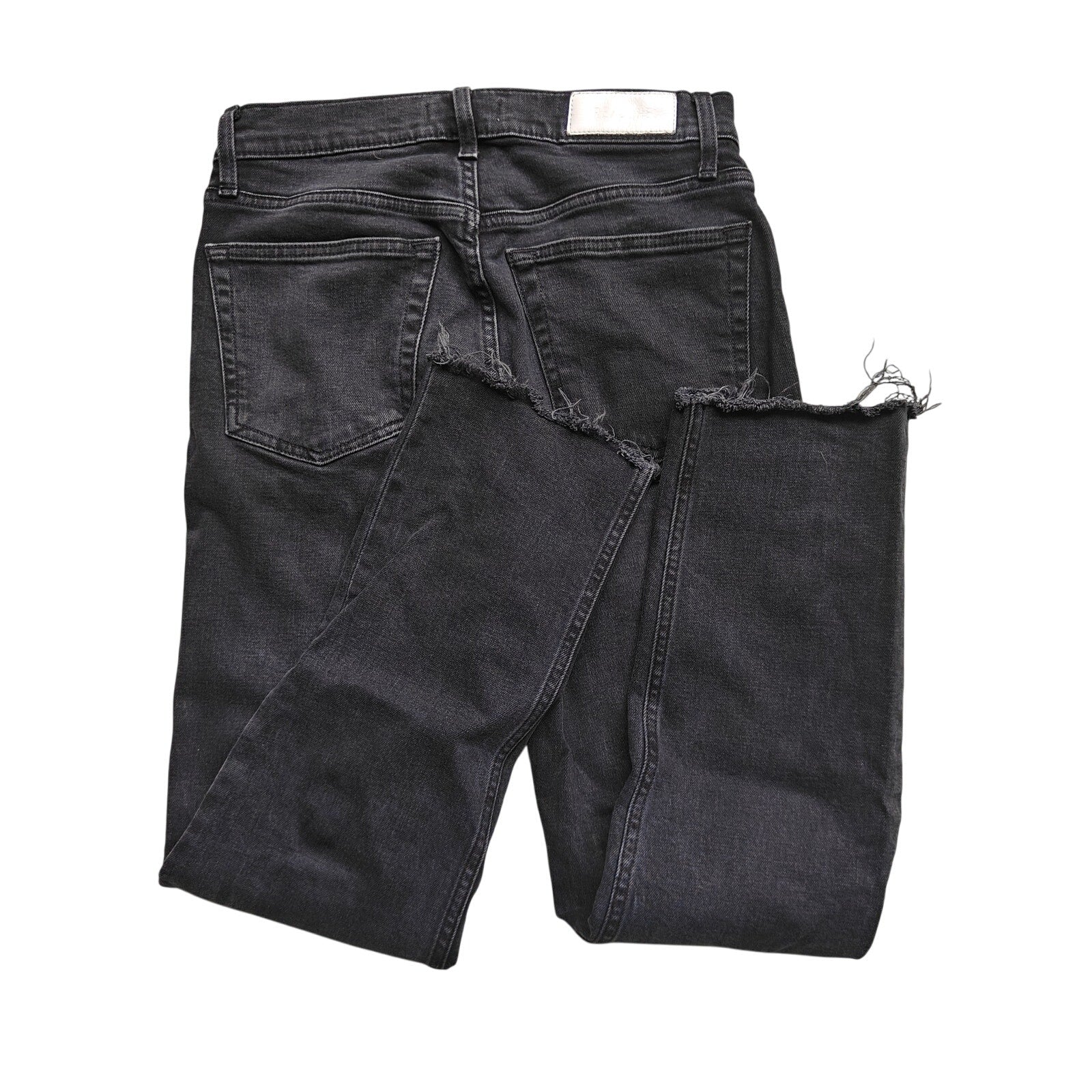 RE/DONE — known for its game-changing transformations of vintage Levi’s into modern, sustainable denim pieces. Style & Fit: High-rise stove pipe—mid-rise through the hips with a straight, slightly tapered fit toward the raw-cut hems. Cropped with a worn-in vibe. Button fly.