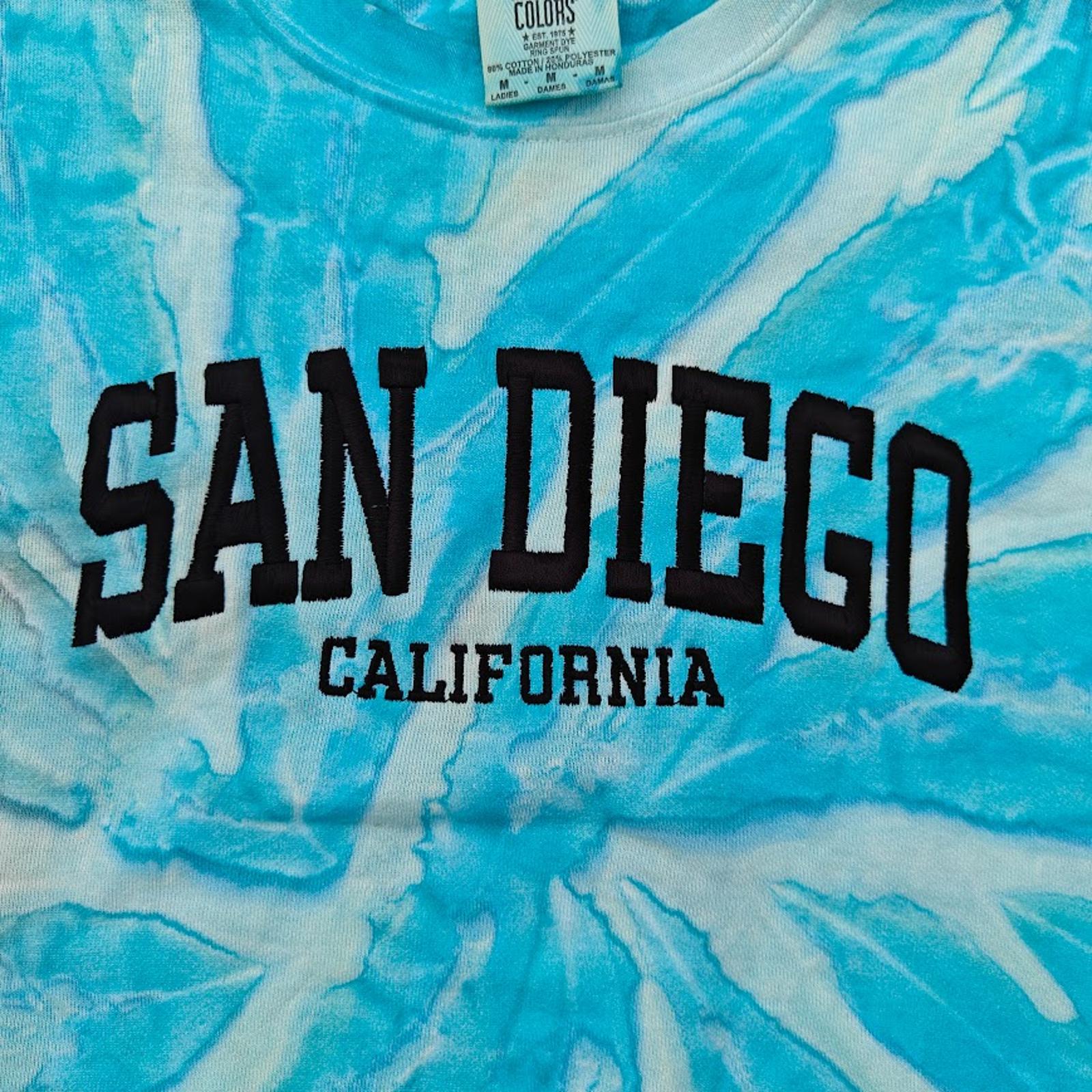 Rep your love for San Diego with this eye-catching tie-dye sweatshirt! 🌊 Featuring bold San Diego California lettering across the chest, this cozy pullover blends vibrant turquoise blue and white tie-dye with a touch of gray for a unique look. Perfect for beach days, casual wear, or layering in cooler weather.