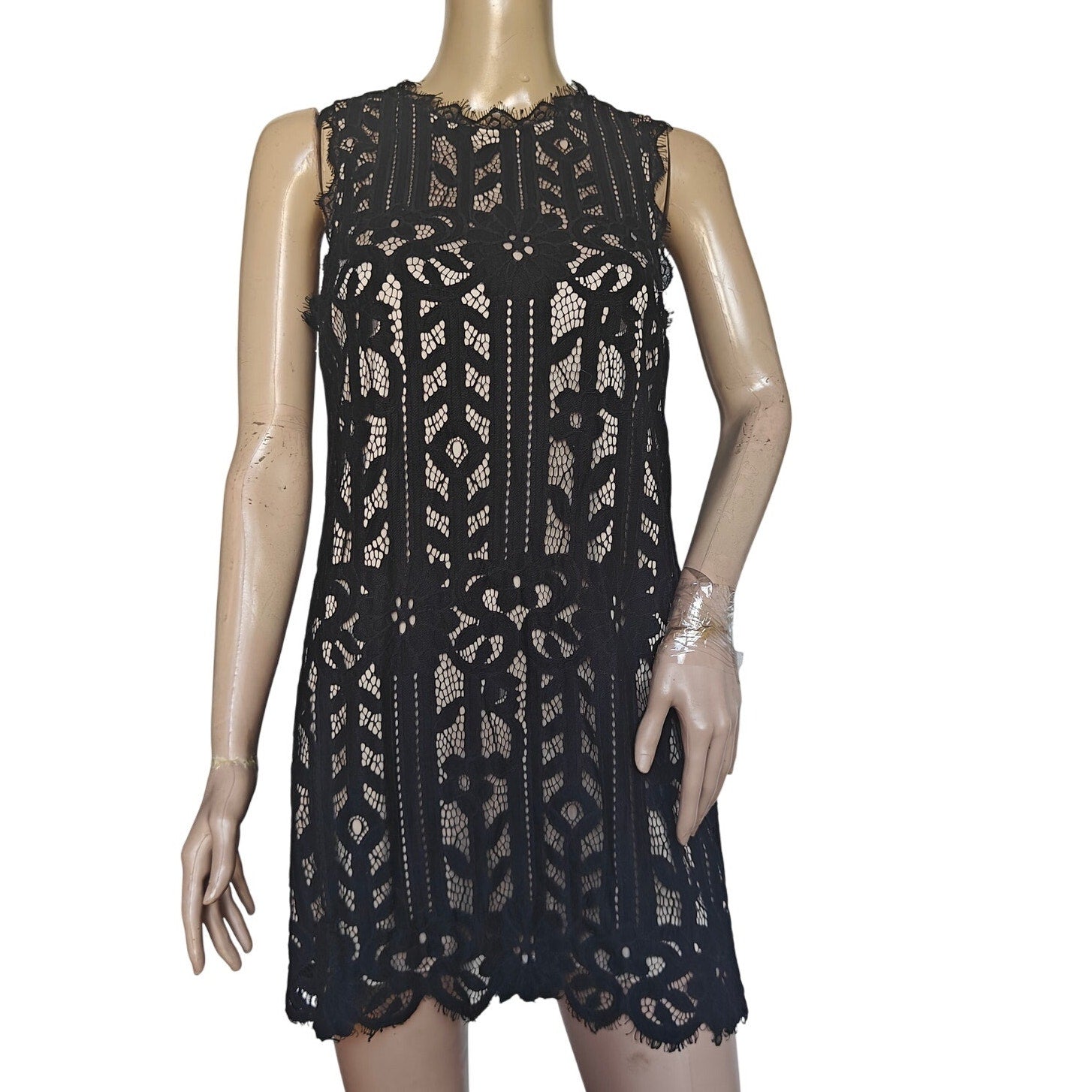Elegant black lace mini by Speechless in Size S. Features a classic crew neck, sleeveless silhouette, intricate floral/geo lace overlay with a nude/beige lining, and a scalloped hem. Easy pull-on/back-zip style (see photos). A timeless cocktail or semi-formal piece—perfect for weddings, date night, homecoming, or holiday parties.