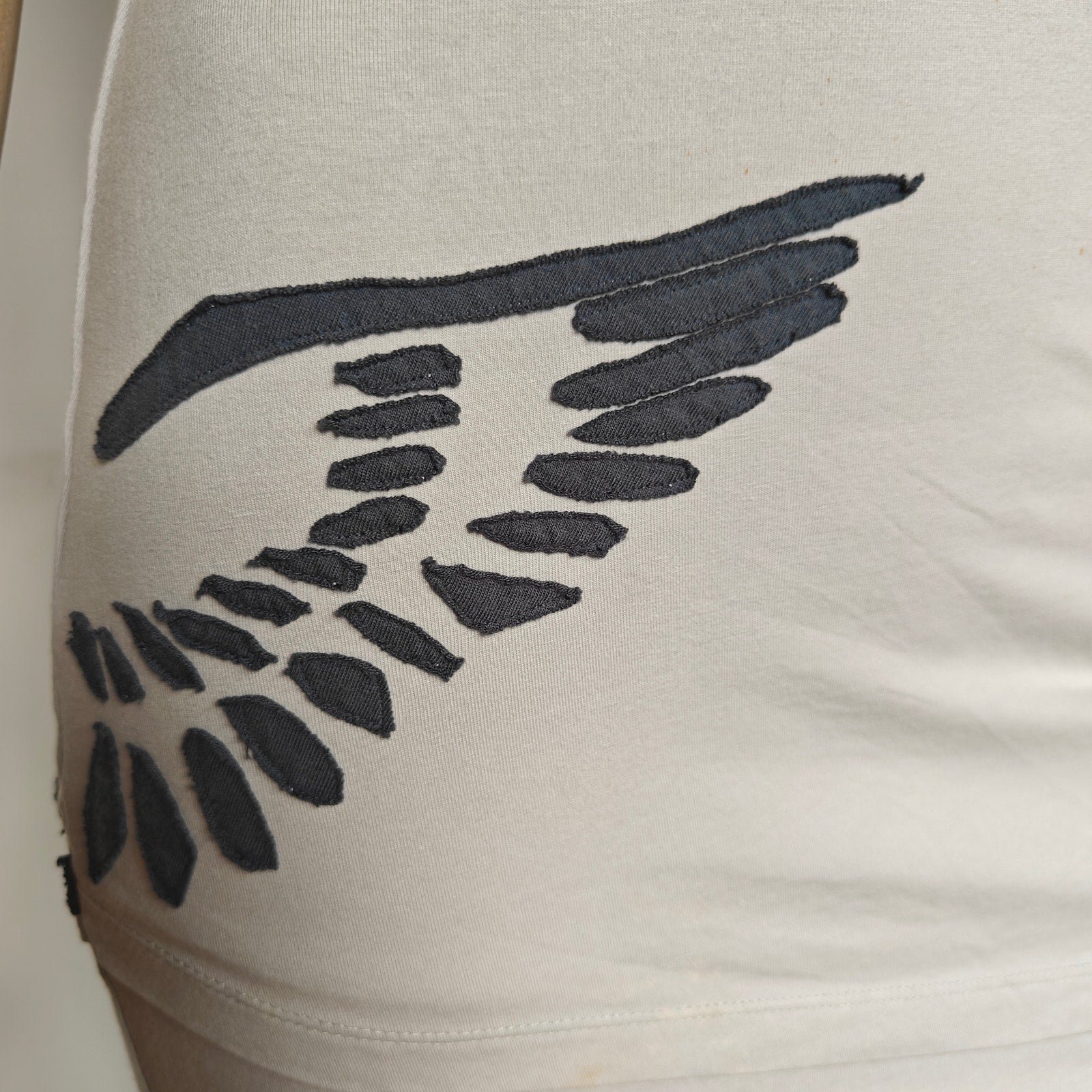 Sleeveless tank silhouette with scoop neck, bodycon midi fit, and black wing