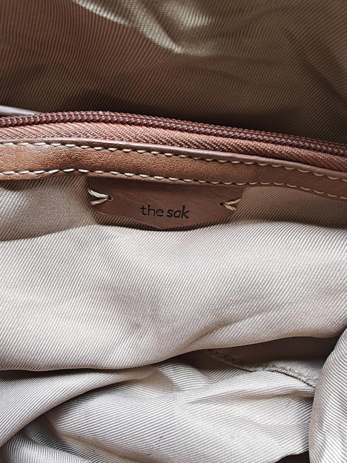This The Sak tan leather shoulder bag is the perfect everyday boho-chic accessory. Made with genuine leather, it features woven detailing, wooden bead tassels, and a spacious interior for all your essentials. A versatile purse that works for casual outings, office, or travel.