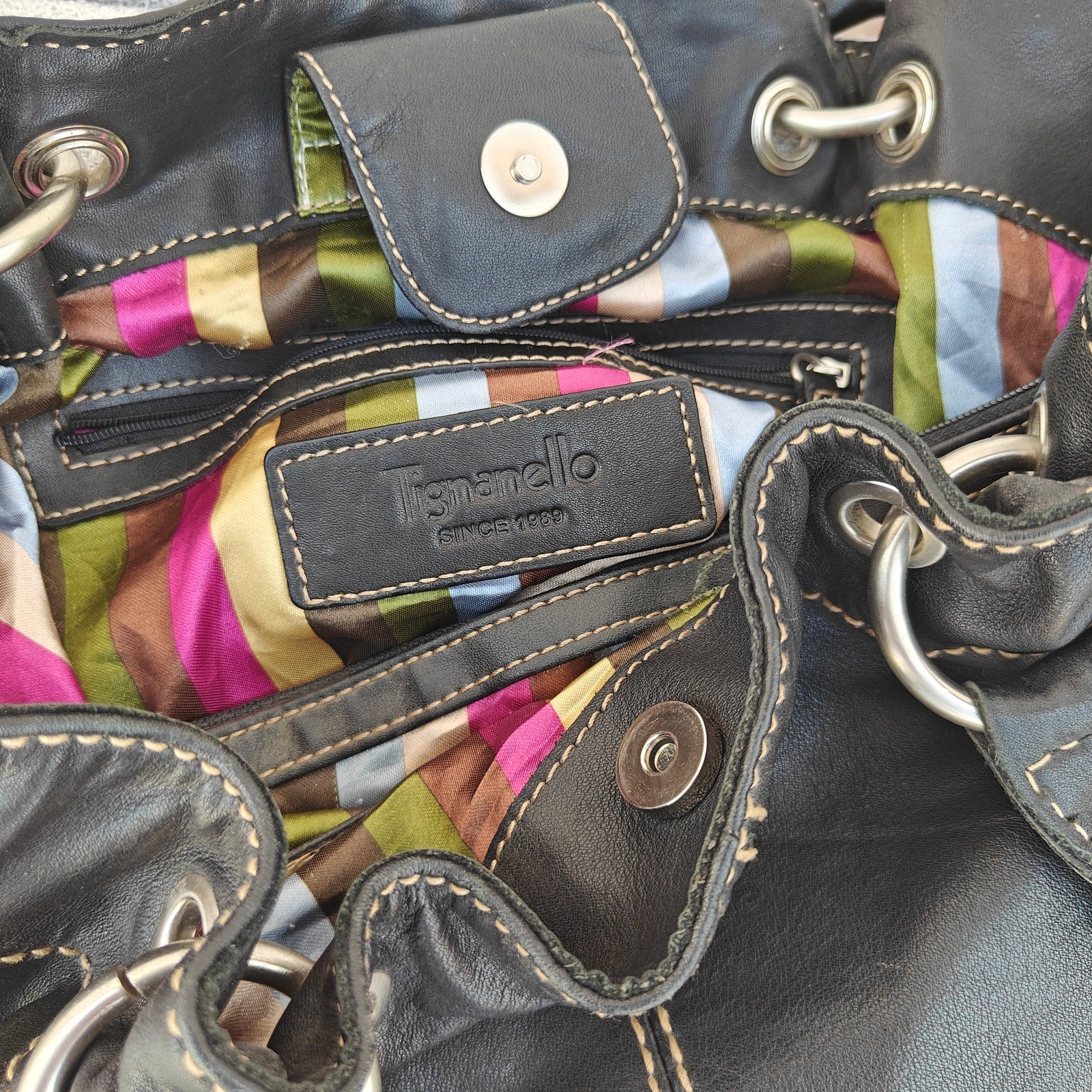 Classic Tignanello genuine leather shoulder bag in black with contrast tan stitching. Features double shoulder straps, ring/grommet hardware with soft gathered top, magnetic snap closure, and a roomy main compartment. Interior has the signature multi-color striped lining with zip and slip pockets to keep essentials organized. Medium everyday size—great for work, errands, or travel. Preloved with normal creasing and light wear consistent with use; clean lining and sturdy straps/hardware.