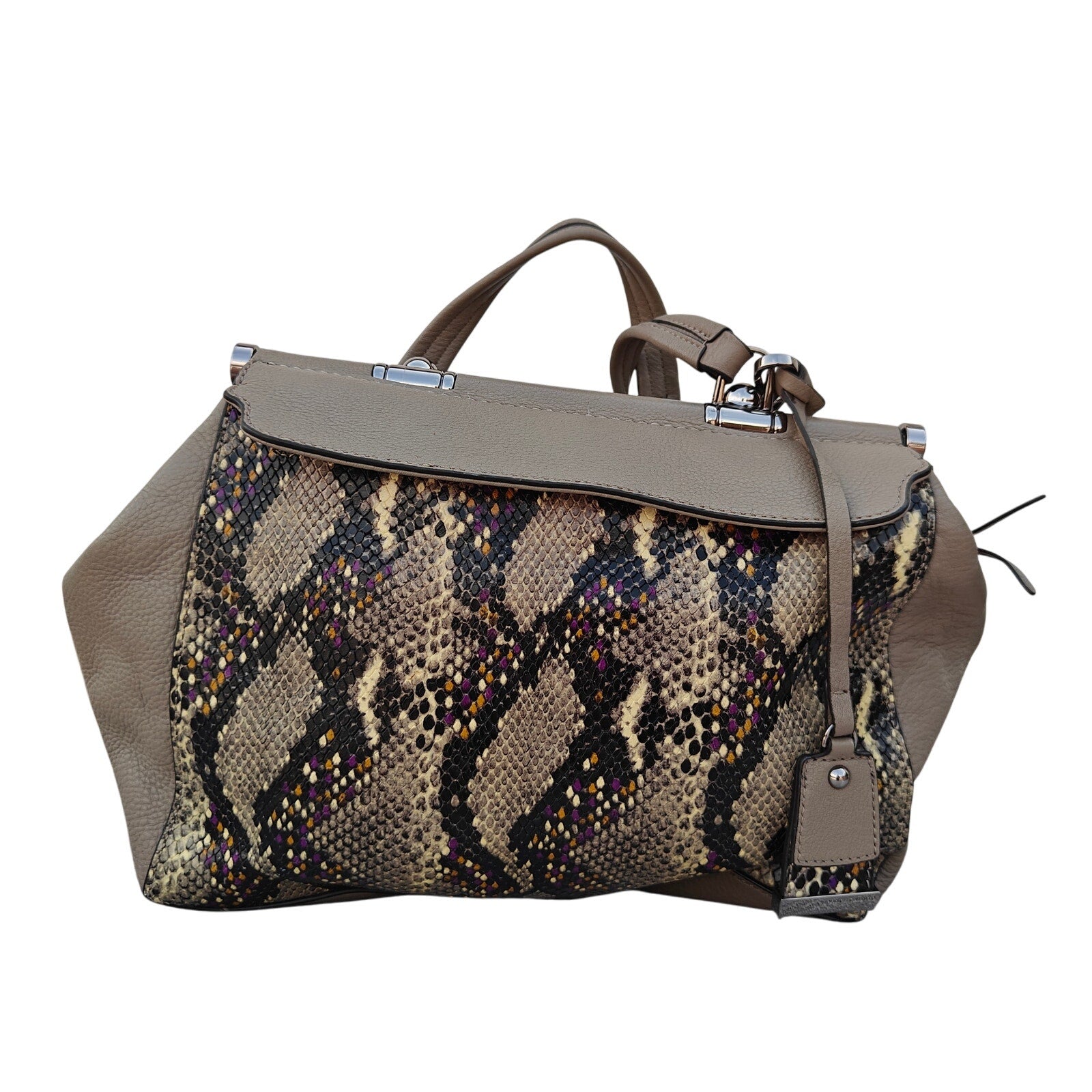 Chic and versatile Vince Camuto satchel crafted in supple pebbled leather with a striking snake-embossed front panel. Features a structured top handle, removable/adjustable crossbody strap, flap top with bar hardware, secure zip compartment, interior zip & slip pockets, and soft lining. Neutral taupe body pairs with everything; perfect as an everyday work bag or polished weekend carry.