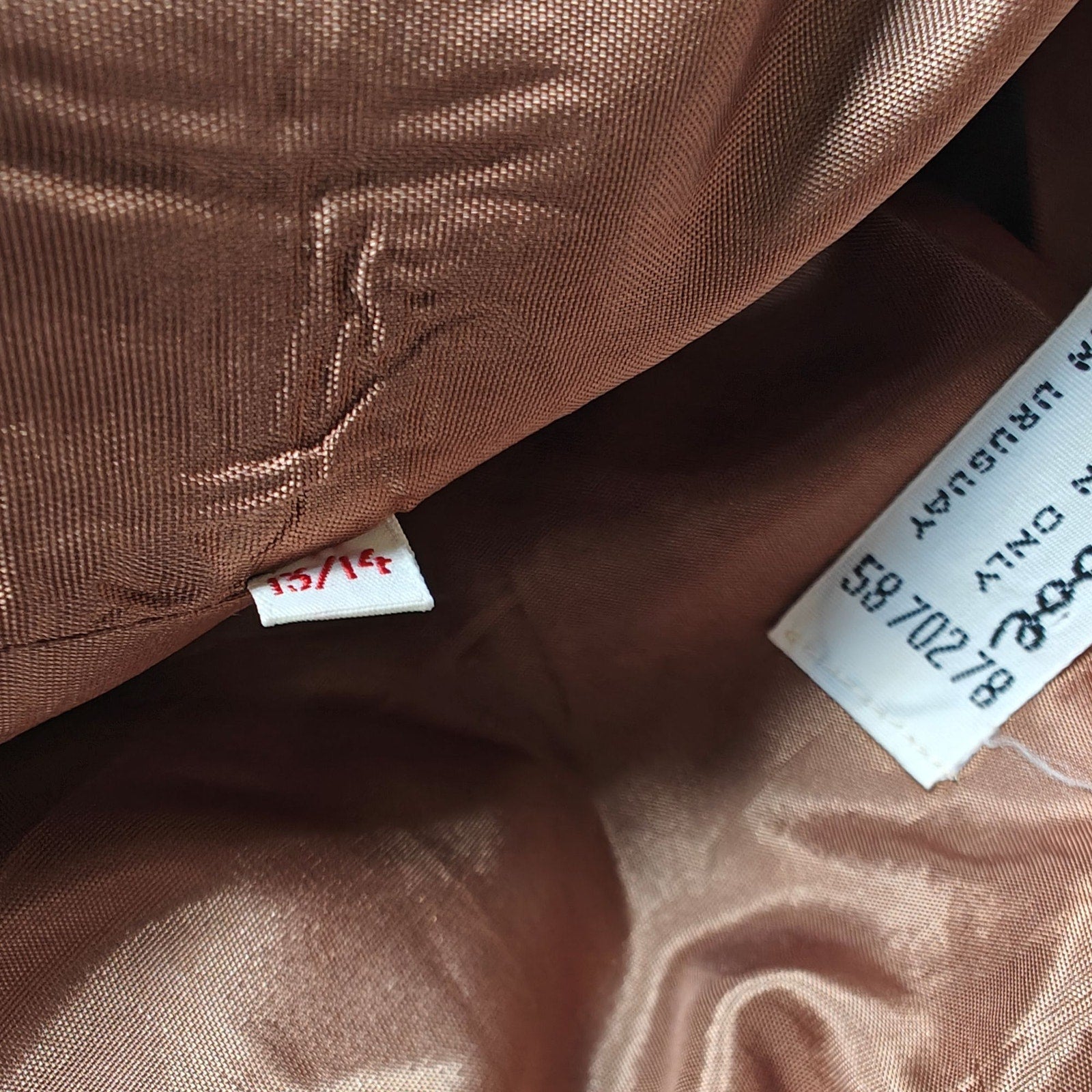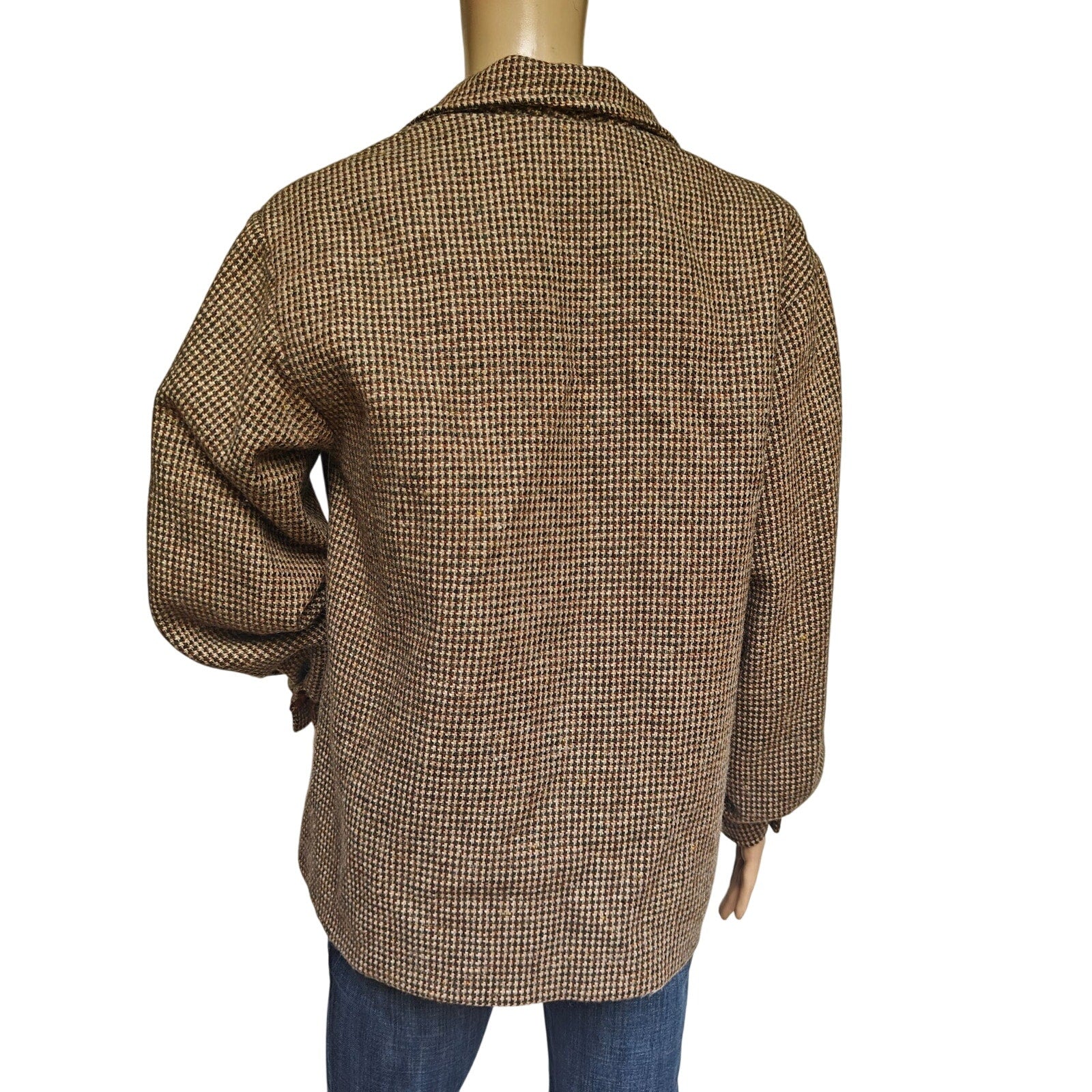 Step back in time with this vintage 1970s wool tweed jacket, made in Uruguay from 100% pure wool. Features a timeless brown houndstooth check pattern, structured collar, front button closure, and two large patch pockets. Fully lined with a silky interior for comfort.