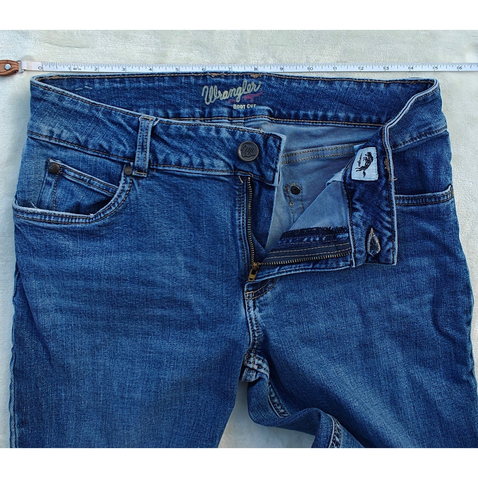 Classic Wrangler bootcut jeans in a versatile medium blue wash. Women’s/Juniors size 11 x 32 with a little stretch for comfort and shape. Features five-pocket styling, zip fly with button closure, and bootcut leg that pairs perfectly with sneakers or boots. Fabric content: 99% cotton, 1% spandex (see tag). Great everyday denim—casual, Western, or rodeo-ready vibes. Preowned in good condition with normal wear; one belt loop is unstitched at the back, see photo.