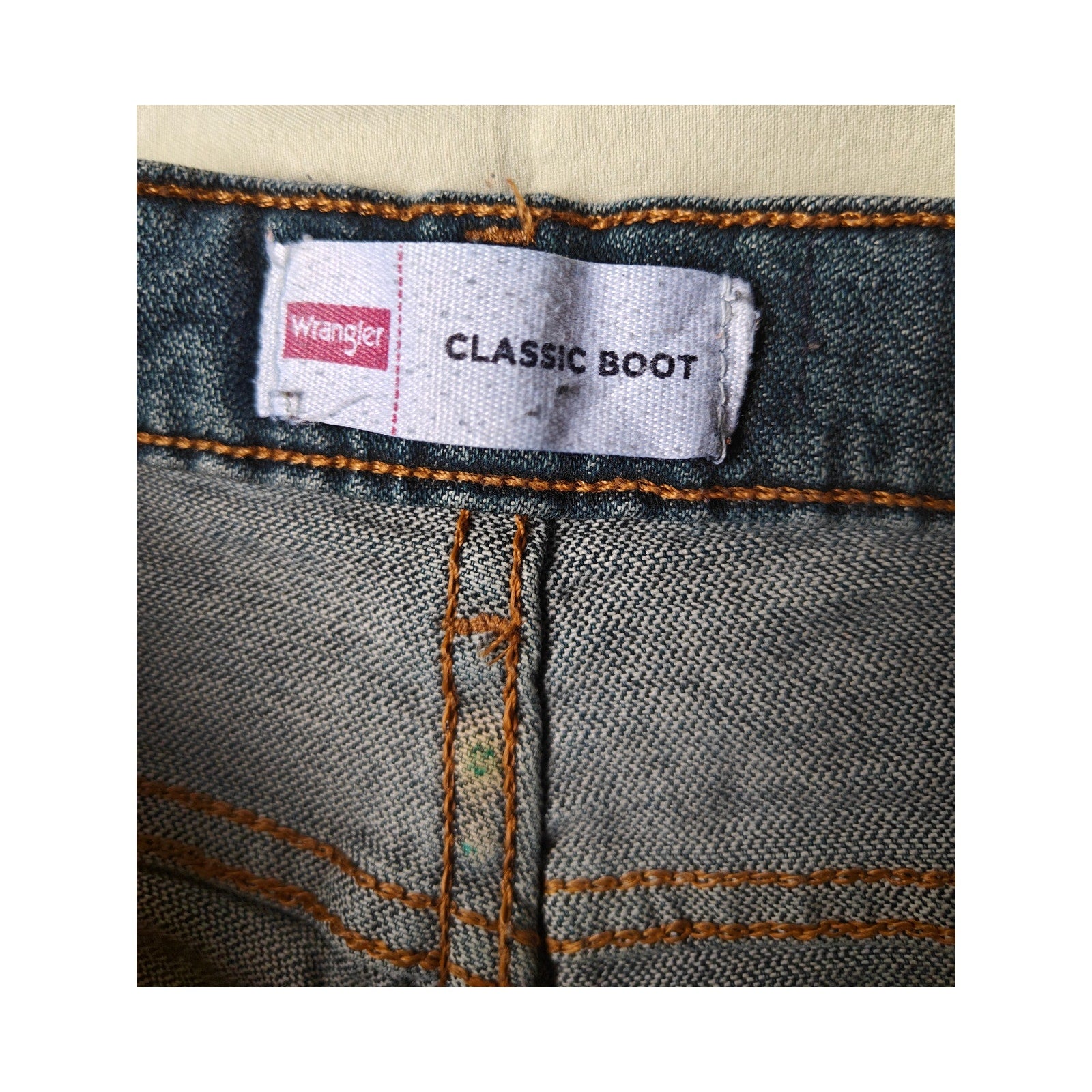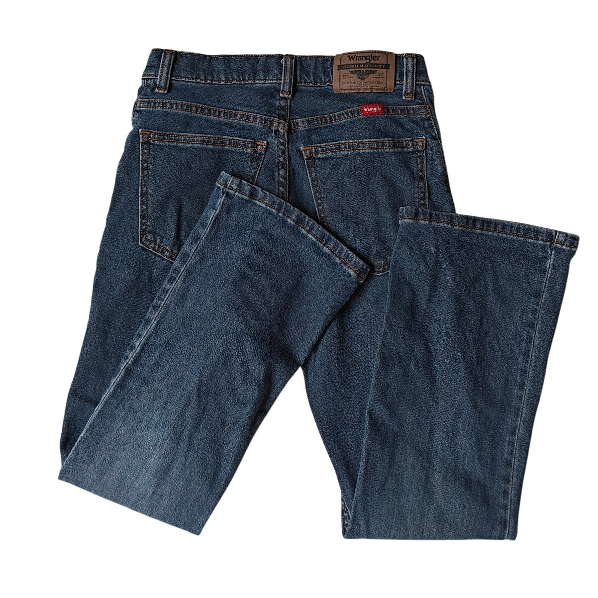 Durable medium-wash Wrangler Classic Boot jeans, size 14 Slim. 5-pocket, zip fly, straight/bootcut leg—perfect for school, ranch, or rodeo looks. Clean and ready to wear.